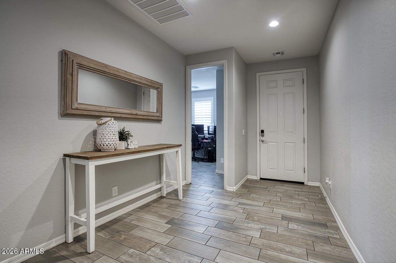 Welcome to Greer Ranch in Surprise, Arizona; 5-bedroom, 4-bathroom single-story multi-generational home built by Shea Homes in 2019 with 2,827 square feet, a split floor plan, a dedicated multi-gen area, and a sparkling private pool! As soon as you pull up, youll notice the 3-car garage, low-maintenance desert landscaping, and the clean stucco-and-stone curb appeal. Step inside through the foyer to wood-look tile flooring that flows throughout the entire home. No carpet in this house. The open-concept living area features 9-foot flat ceilings, plantation shutters on every window, and plenty of room for everyone. The perfectly placed kitchen opens directly to the living and dining areas and features white shaker cabinets, granite countertops, a massive center island with a breakfast bar seating, subway tile backsplash, pendant lighting, a gas cooktop, built-in electric double ovens, built-in microwave, stainless steel refrigerator, dishwasher, disposal, and a walk-in pantry with tons of storage. The dining area sits just off the kitchen with sliding glass doors leading out to the covered patio and backyard, perfect for entertaining! What sets this home apart is the dedicated multi-gen area with its own full bathroom, ideal for so many different living situations. The primary bedroom is separated from the secondary bedrooms and features a walk-in closet with double hanging rods and built-in shelving. The primary bathroom includes a double vanity, a glass-enclosed walk-in shower, and a private toilet room. On the opposite side of the home, 3 additional bedrooms are split from the primary, each with ceiling fans, plantation shutters, and wood-look tile flooring. Two of the secondary bathrooms feature dual sinks, walk-in showers, and modern cabinetry. The dedicated laundry room has full-size washer and dryer hookups with a 220V dryer outlet and built-in shelving above. Step outside to a low-maintenance backyard with a sparkling private pool equipped with a variable speed pump, a covered patio, and gravel landscaping surrounded by block fencing for total privacy. The 3-car garage with direct access provides great room for vehicles plus storage. Greer Ranch is a community in Surprise with walking paths, a playground, and easy access to Loop 303, Cactus Road, and nearby shopping and dining.