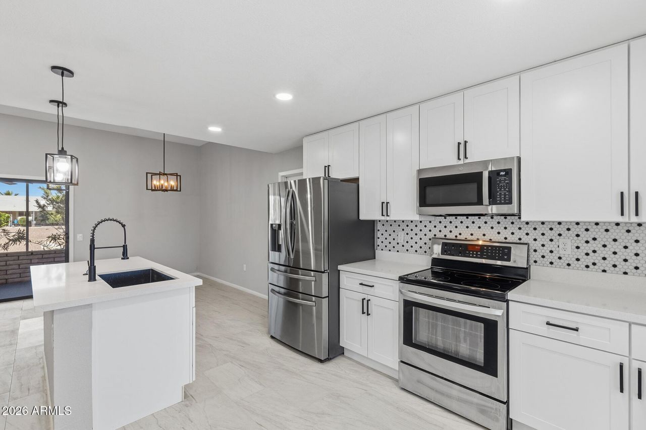 Bright & Updated Living! This upgraded home showcases a spacious kitchen with a center island, stainless steel appliances, tile backsplash & white cabinetry accented by sleek black hardware. High ceilings throughout create an open feel filled with abundant natural light, complemented by new tile flooring, plush carpet, & fresh interior paint. The large living area flows seamlessly to a screened-in patio through a glass sliding door. Bathrooms have been thoughtfully updated with unique tile flooring, new vanities & upgraded fixtures. Bedrooms feature comfortable carpet, while the primary suite offers a walk-in closet. The backyard presents a blank slate with room to customize, paired with fresh exterior paint & low-maintenance desert landscaping, plus transferrable leased Tesla solar panel for added efficiency. Situated on a desirable corner lot within a quiet cul-de-sac, this home is located in Sun City with access to community amenities including pools, spa, tennis & pickleball courts, recreation centers & more. Conveniently located near Loop 101 with close proximity to Peoria Sports Complex, Arrowhead Towne Center & a wide variety of dining, shopping, & recreation.