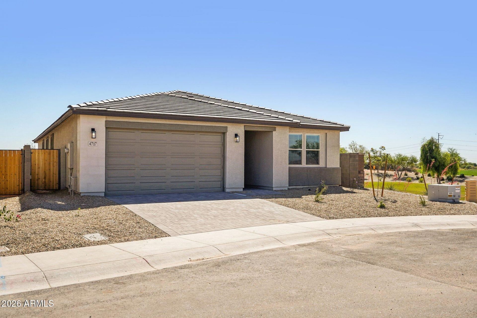 Spacious, stylish, and designed with flexibility in mind, the Lavender Plan offers 2,222 sq. ft. of single-level living with 4 bedrooms, 3 full baths, a dedicated guest retreat, and a 2.5-car garage. The Modern Desert exterior makes a strong first impression, enhanced by paver detailing at the driveway for added curb appeal.Step inside to a bright, open-concept layout where 8-foot interior doors and expansive living areas create a sense of volume throughout. At the center of the home, the kitchen blends function and design with selections from the Timeless Collection, featuring 42 white cabinetry, quartz countertops, a contemporary tile backsplash, and a full set of stainless steel appliances. The layout flows effortlessly, making it ideal for both everyday living and hosting.The living spaces are finished with durable wood-look plank tile, while the bedrooms offer a softer touch with comfortable carpeting. Bathrooms continue the elevated aesthetic with quartz countertops and oval sinks for a clean, polished look.A 4-panel sliding glass door in the great room opens to the backyard, creating an easy transition to outdoor living and filling the home with natural light. Additional conveniences include 2 faux wood blinds, a soft water loop, washer and dryer, and pre-wiring for pendant lighting in the kitchen.Blending modern finishes with practical design, the Lavender Plan is move-in ready and built for the way you live today.
